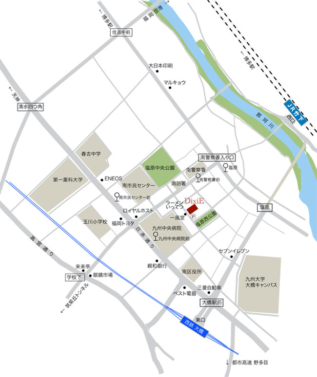 ・JR博多駅より鹿児島本線 竹下駅下車 西口より向かいの橋を渡り 徒歩 9分