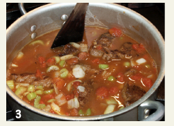 | 3, 浅鍋に取り置いた肉と2の材料を移しチキンヴイヨンとトマトを加える. |