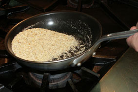 | 2, フライパンにパン粉,ローズマリー,バジルを入れ弱火でから煎りしておく. |