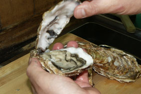 1, 牡蛎の殻をワイヤーブラシを使って流水でよく洗い,牡蛎の蓋の方を上にして