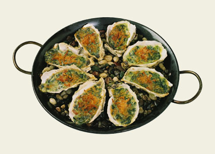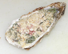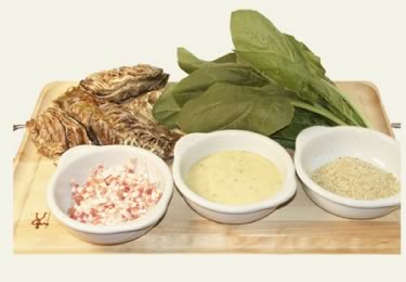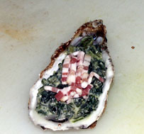 5, 開けた牡蛎の上にソースとほうれん草のミックス,ベーコンの細切り,